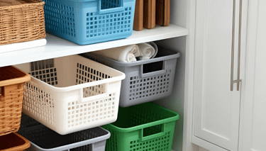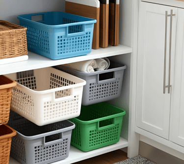 Storage bins, drawer organizers, plastic containers, shelving units, closet organizers, food storage containers, laundry baskets, and much more!