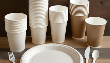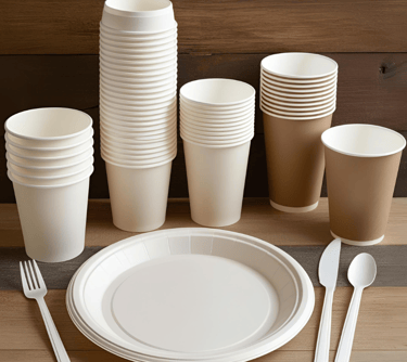 Disposable plates, disposable cups, plastic utensils, paper napkins, trash bags, food storage bags, disposable tablecloths, single-use paper and plastic straws, takeout containers, and much more!